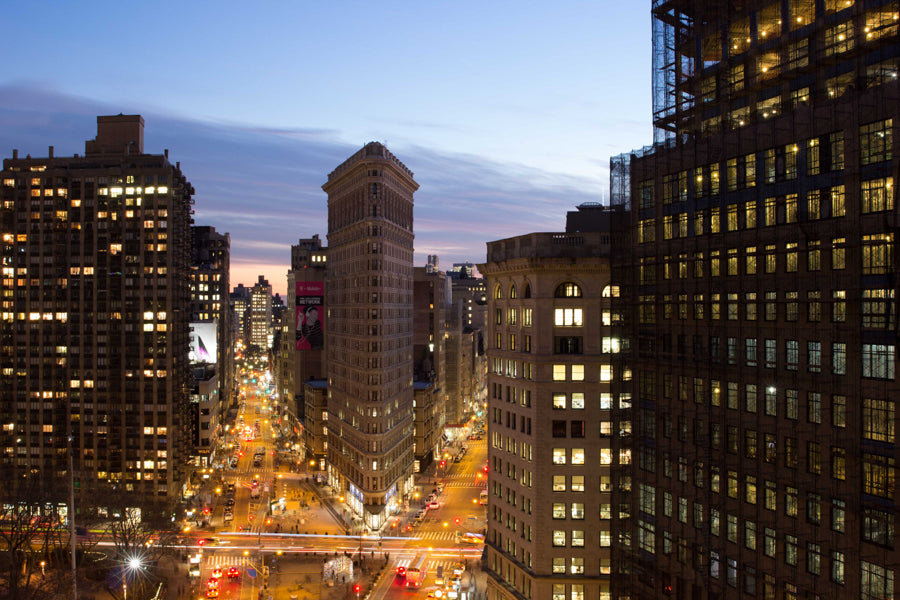 Flatiron épólet New York, Manhattan. A kép naplementekor, kékórában készült. Fekvő formátum.