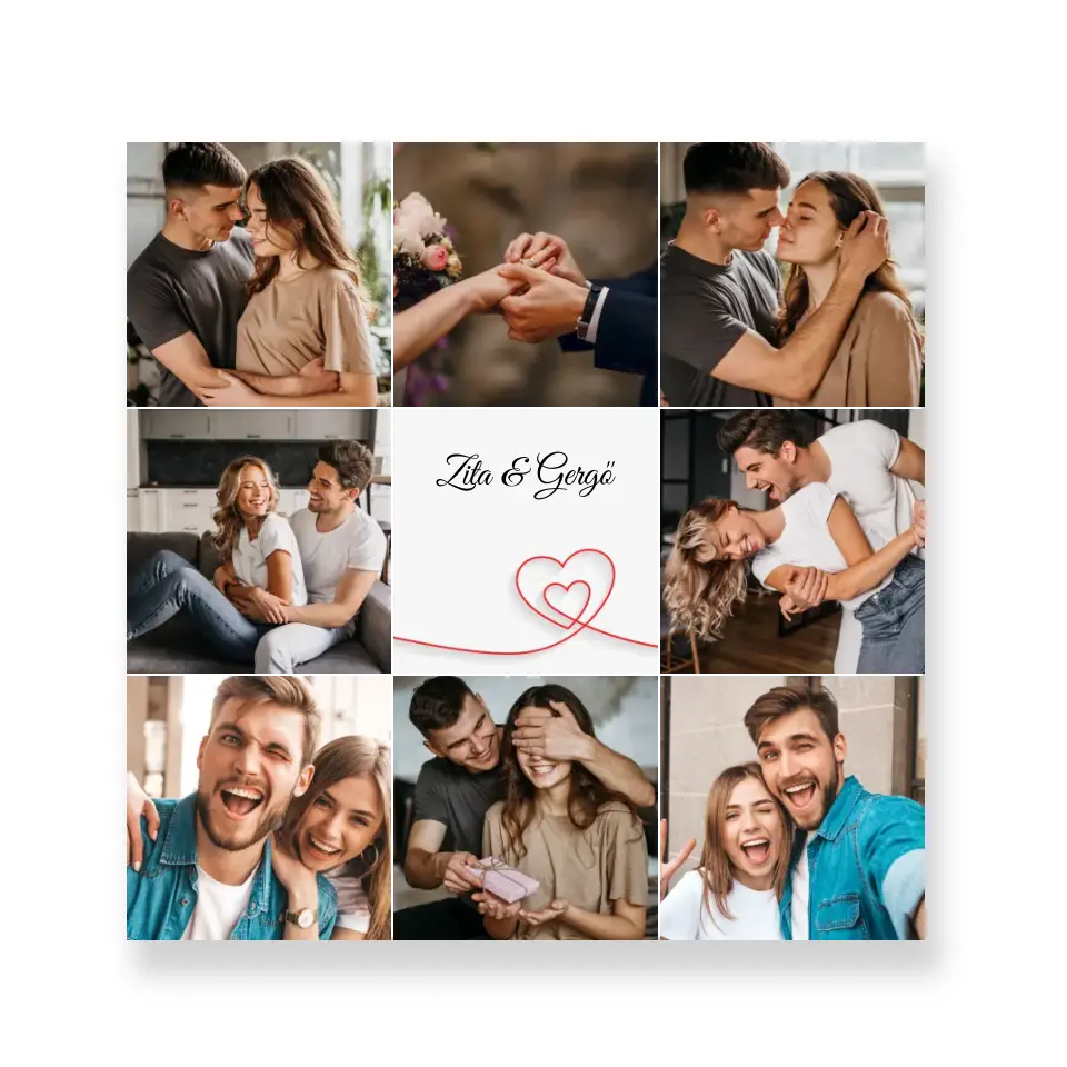 A 8 képből álló Valentin napi fotókollázs vászonkép saját fényképekkel személyre szabható, a feltöltött képeken kívül lehetőséged van személyes üzenet vagy idézet hozzáadására, ezekhez színt is tudsz választani*. Ideális ajándék szerelmeseknek, bármilyen alkalomra. Legyen szó születésnapról, karácsonyról, Valentin napról, évfordulóról vagy csak mert szereted a párod, lepd meg őt közös emlékeitekből összeállított vászonkép kollázzsal, az örömtől ragyogó szempár garantált.